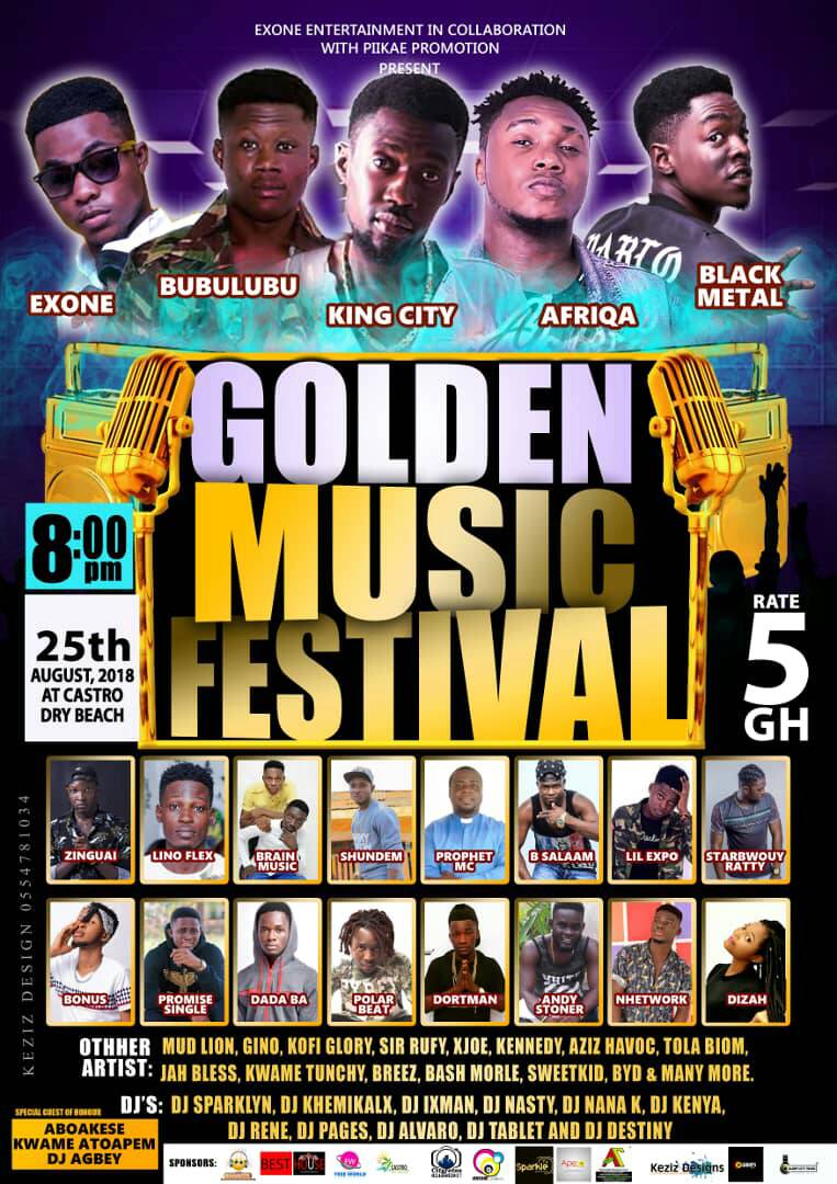 According to Piikae, GoldenMusicFestival supposed to come off on the 25th of August 2018 at Castro dry beach (Tarkwa), This programme was to project all golden city artist and reunite them as one team but with some technical challenges and will be very glad to tackle them before the event. .